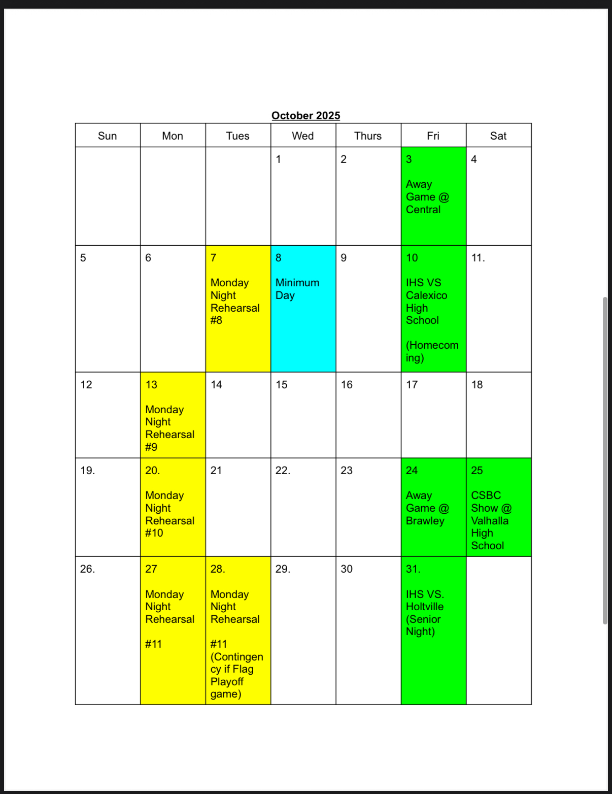 IHS Football & Halftime Performance Schedule