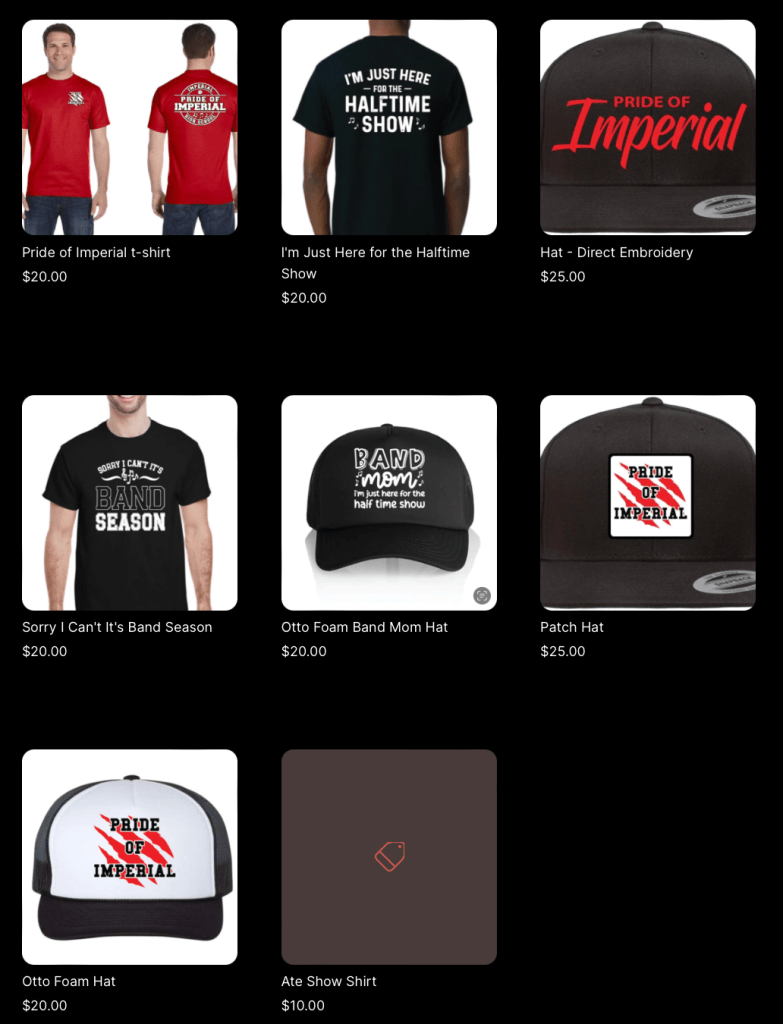 The Merch shop was created last year to promote the Pride of Imperial band and help generate funds for the band. We will also have merchandise at the Football games at the Band Booster Booth. The remaining inventory will be sold until sold out. Next day delivery.